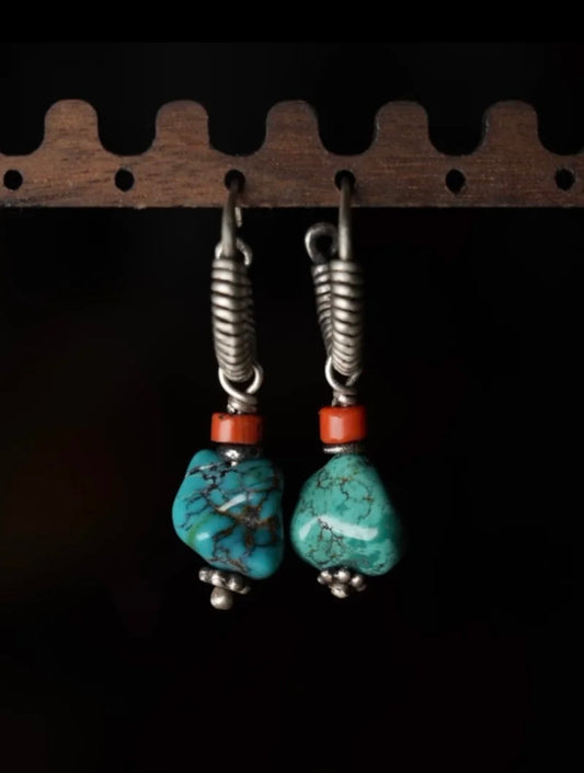 Tibetan turquoise & red coral Sterling silver earrings