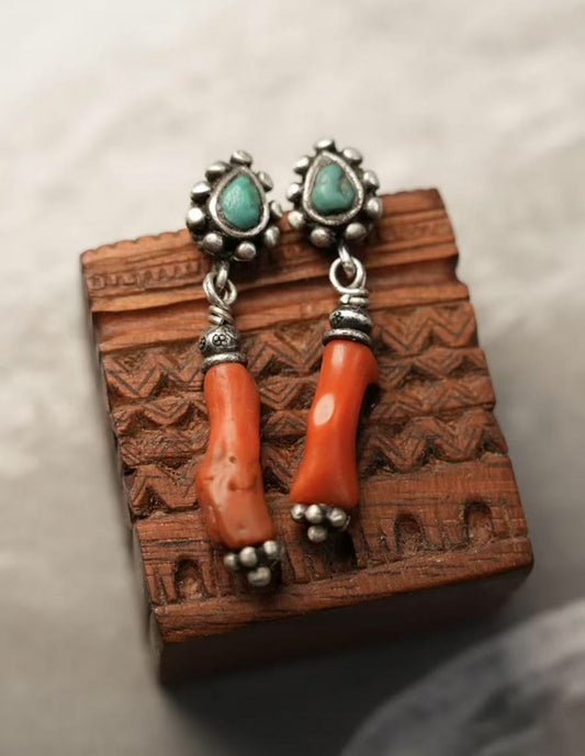 Tibetan Natural Red Coral & Turquoise Sterling Silver Earrings