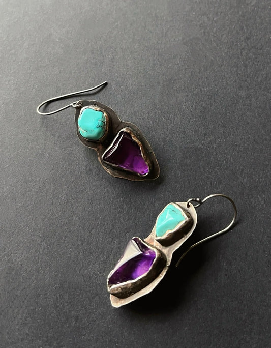 Tibetan Turquoise & Amethyst Harmony 925 Sterling Silver Earrings