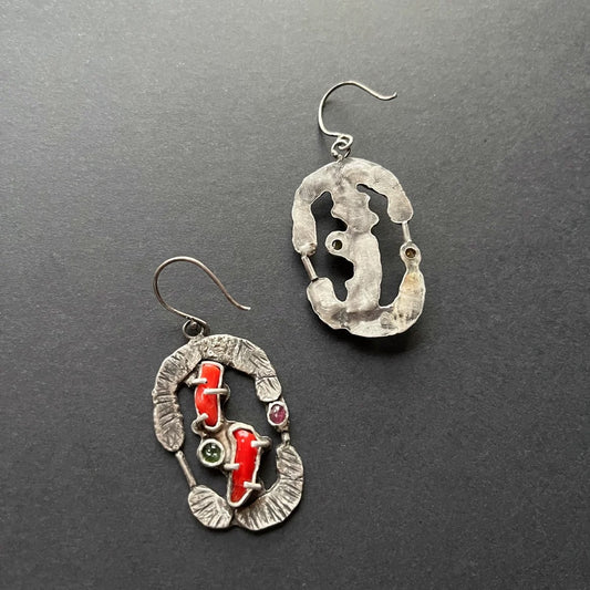 Tibetan Handcrafted Coral & Tourmaline Dangle 925 Sterling Silver Earrings