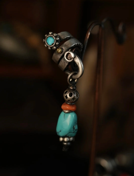 Tibetan Handcrafted Coral & Tourmaline Dangle 925 Sterling Silver Earrings
