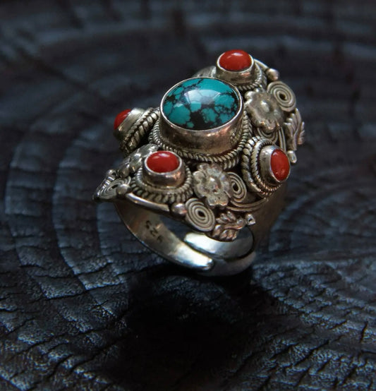 Tibetan Turquoise & Coral Adjustable 925 Sterling Silver Ring