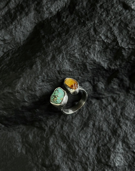 Tibetan Turquoise & Baltic Amber 925 Sterling Silver Ring