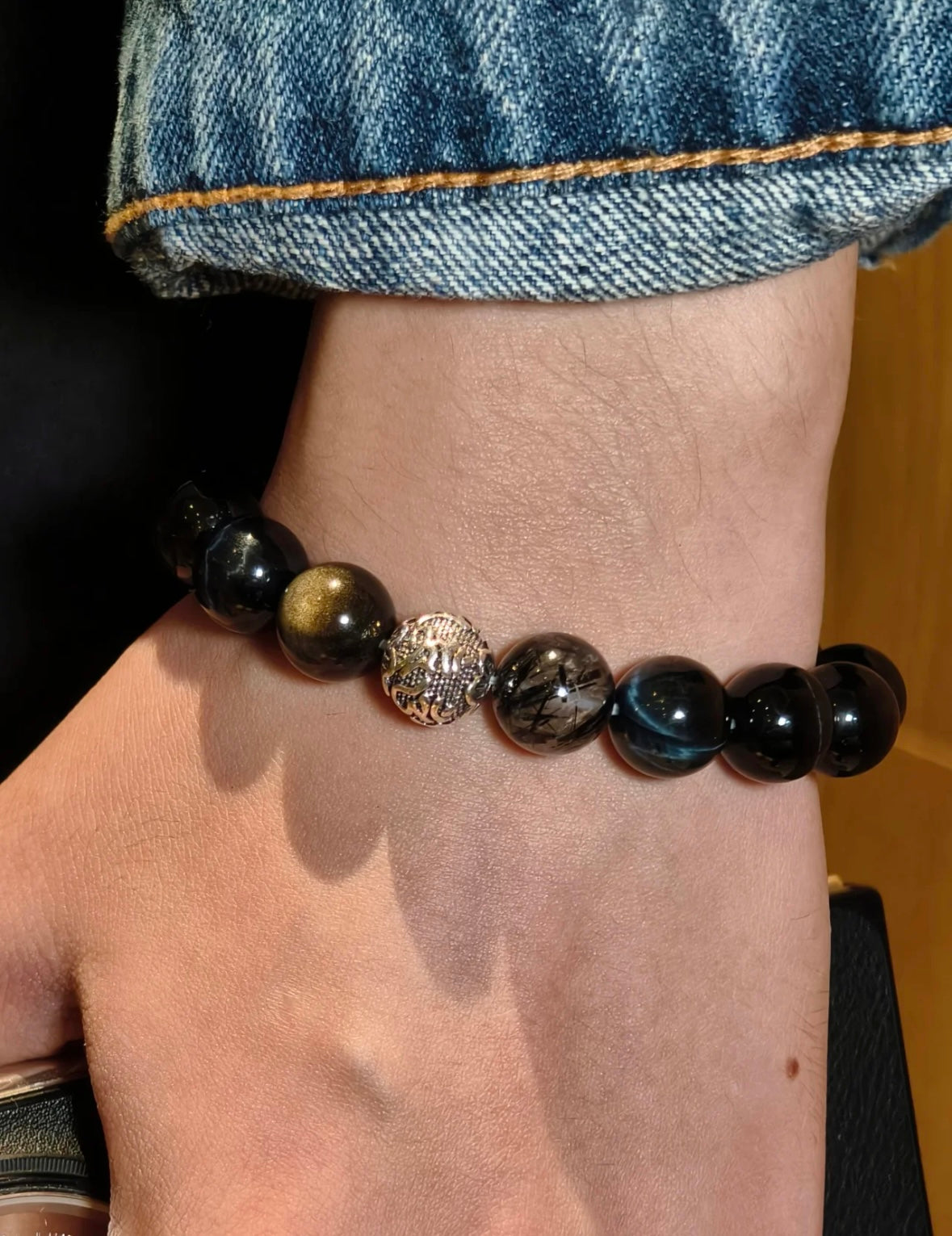 This tactical bracelet merges blue tiger’s eye (charismatic leadership), obsidian (career threat neutralizer), golden sheen obsidian (wealth magnetism), black rutilated quartz (ruthless focus), and 925 silver arrowhead charms. Blue tiger’s eye sharpens persuasive prowess for high-stakes deals, while obsidian annihilates office politics. Golden sheen obsidian’s volcanic gold flecks attract unexpected windfalls, synergizing with black rutilated quartz’s “warrior threads” to lock onto goals. Silver arrowheads, stamped with Tibetan endless knots, create an energy vortex for rapid promotion. A stealth wealth accelerator—it’s armor for boardroom battles and a magnet for hidden opportunities, blending boardroom polish with primal intensity.